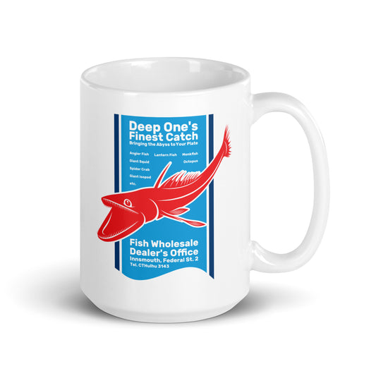 Deep One’s Finest Catch Innsmouth Fish Wholesaler White glossy mug