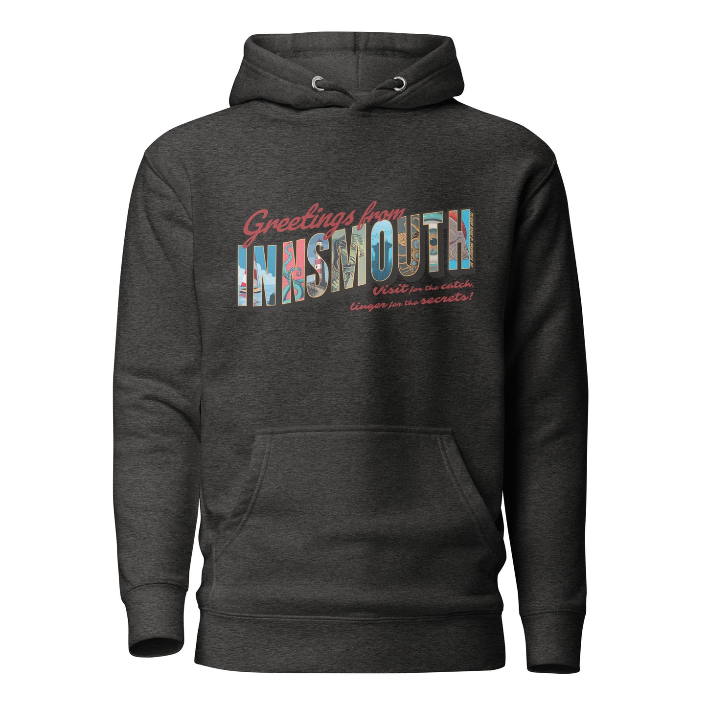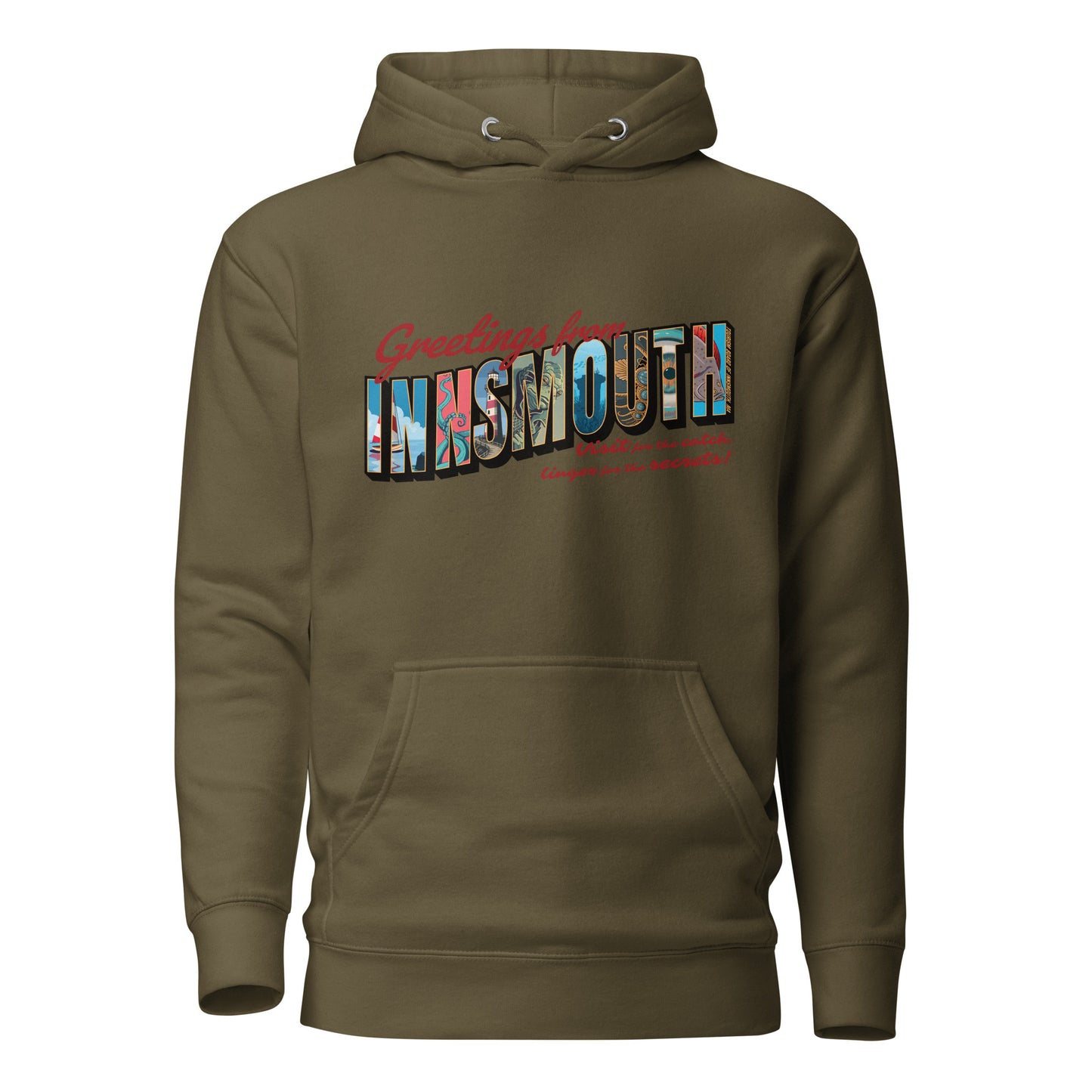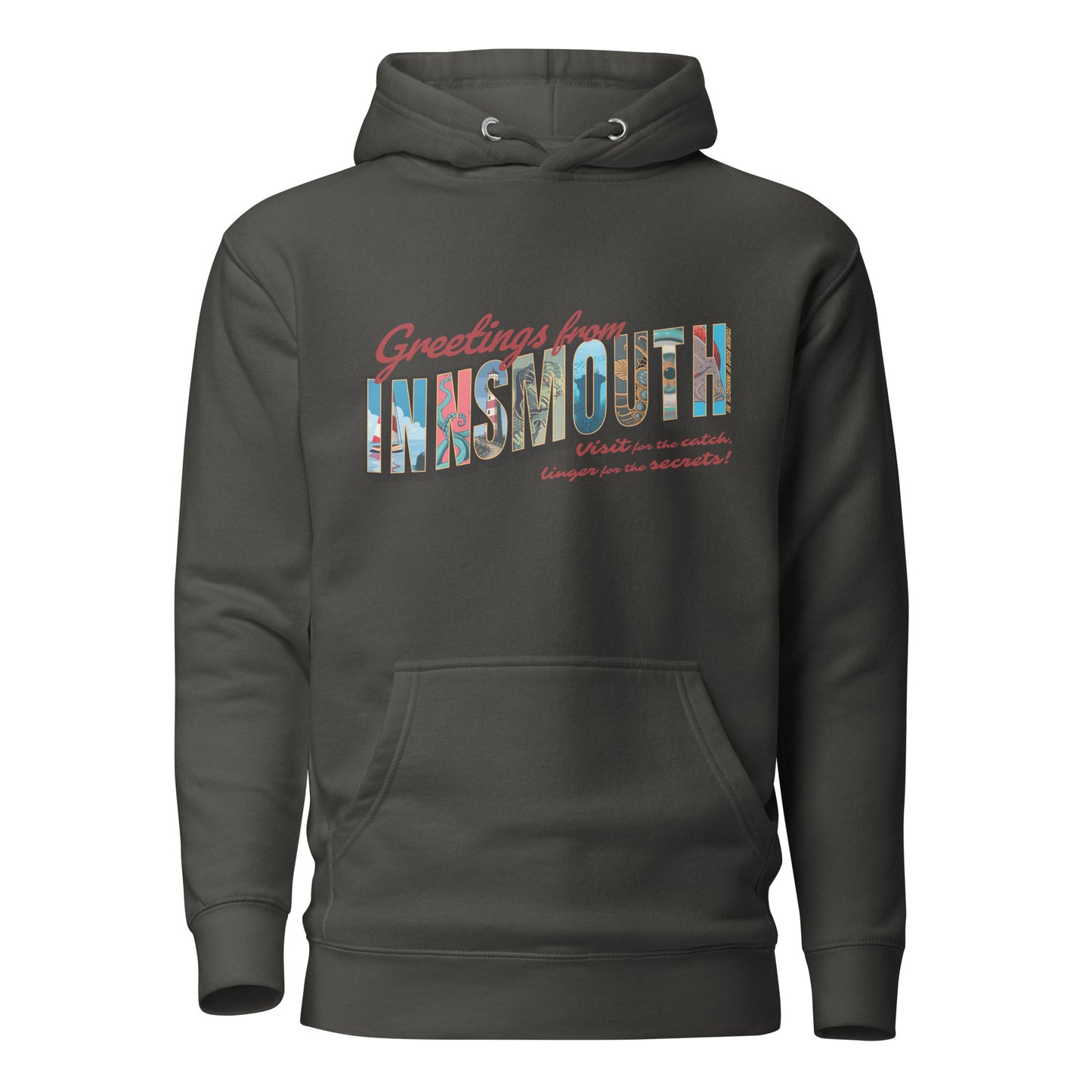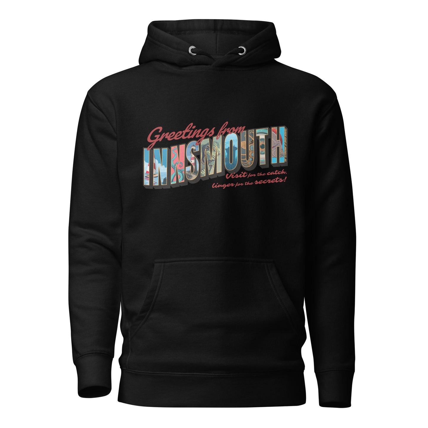 A large‑format "Greetings from Innsmouth" travel‑poster featuring retro letter‑inlay scenes of coastlines, lighthouses and fishing life with subtle, unsettling Lovecraftian motifs. Flat colors, strong silhouettes and halftone textures evoke a nostalgic vintage postcard aesthetic. The design marries classic seaside tourism imagery with an undercurrent of uncanny maritime menace.